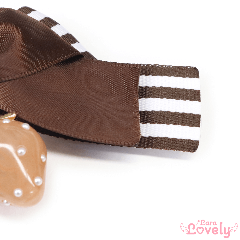 ショコラ・ラテのようなしましまリボンのワンポイントがおしゃれなツインテールヘアクリップです♪ラテカラーのいちごがとってもおいしそう!マーブル模様になっていて、まさにラテ!キャンディのようなつやつやとした質感です♡いつものツインテールを格上げしてくれる魔法のアイテムです☆